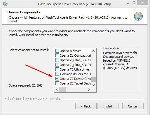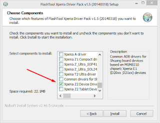 - Yang wajib di Install adalah Flashmode Driver , Fastboot Driver, dan Common driver sesuai dengan Tipe HP yang hendak kalian Flash. Sebagai Contoh kali ini saya akan Flash sony Z2 dan memilih Xperia Z2 Driver ==> Sebetulnya di cheklist semua pun tidak masalah hanya saja akan membutuhkan waktu lebih lama saat installasi dan lebar / tidak ada gunanya jika untuk keperluan flash sony Z2 saja.